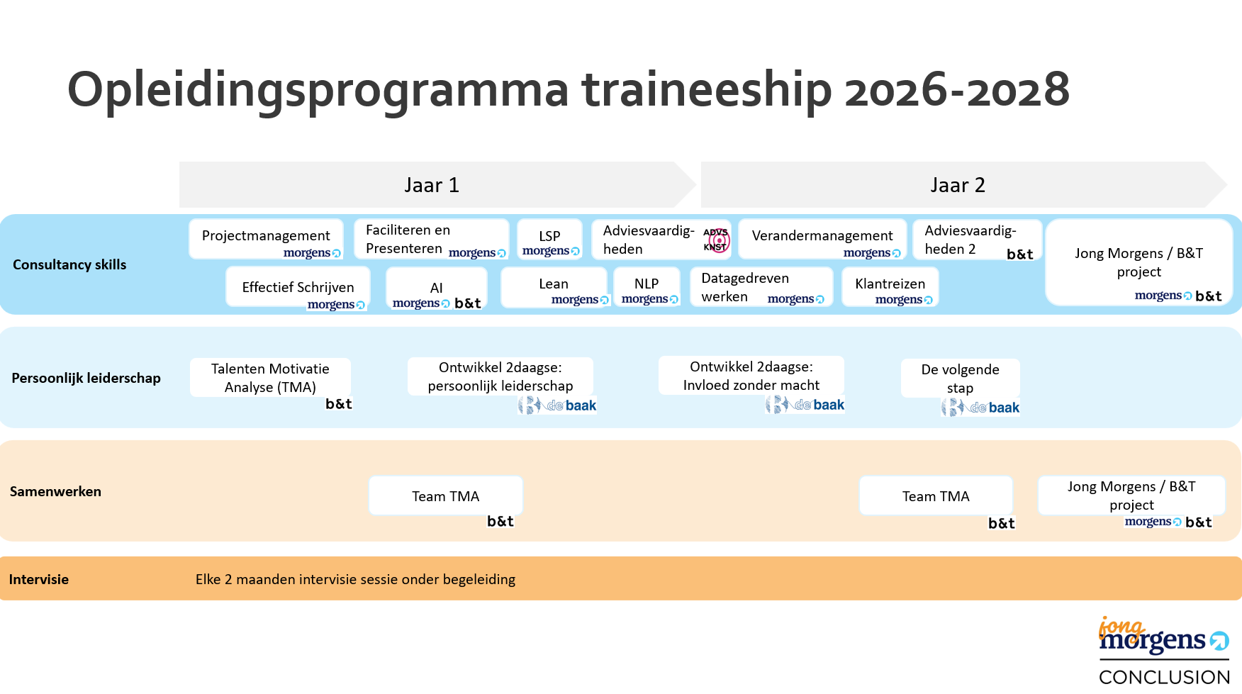 Hier vind je het opleidingsprogramma voor het traineeship van 2026-2028. Het opleidingsprogramma organiseren we samen met B&T. In een gezamenlijke groep van jonge talenten van Jong Morgens en B&T volg je het opleidingsplan en ontwikkel je je samen tot de consultant van Morgen.